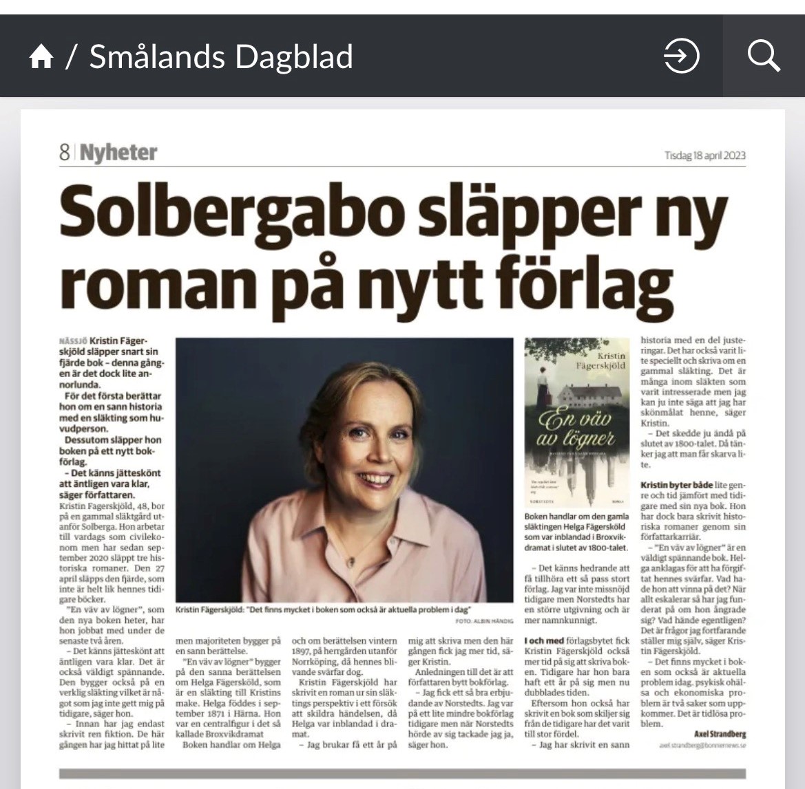 Solbergabo släpper ny roman på nytt förlag, artikel i Smålands Dagblad, 18 apr 2023.